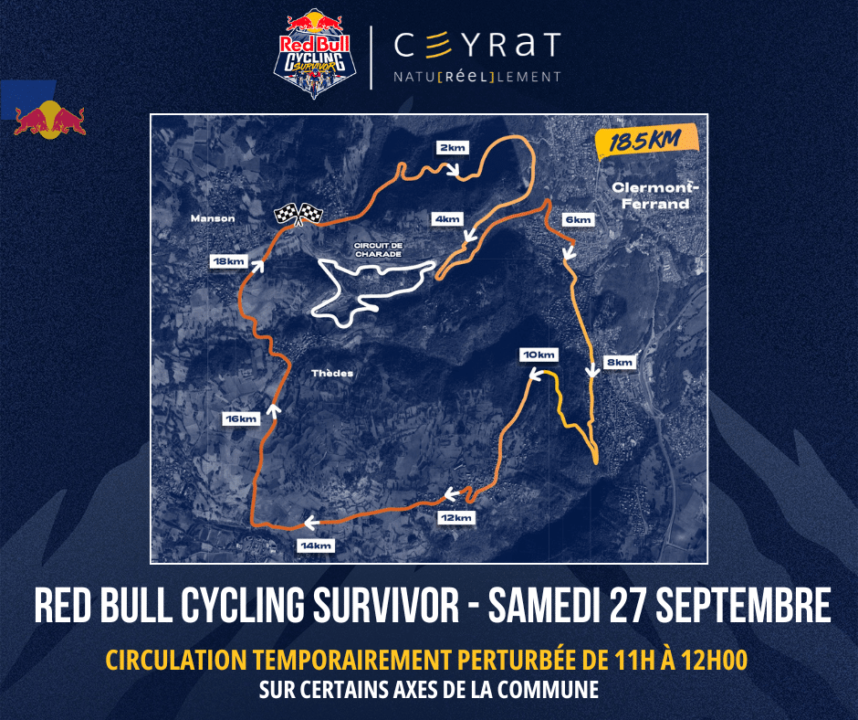 Samedi 27 septembre, la commune accueillera le passage de la course cycliste Red Bull Cycling Survivor. Afin d’assurer le bon déroulement de l’événement, la circulation sera temporairement perturbée de 11h à 12h sur certains axes de la commune.